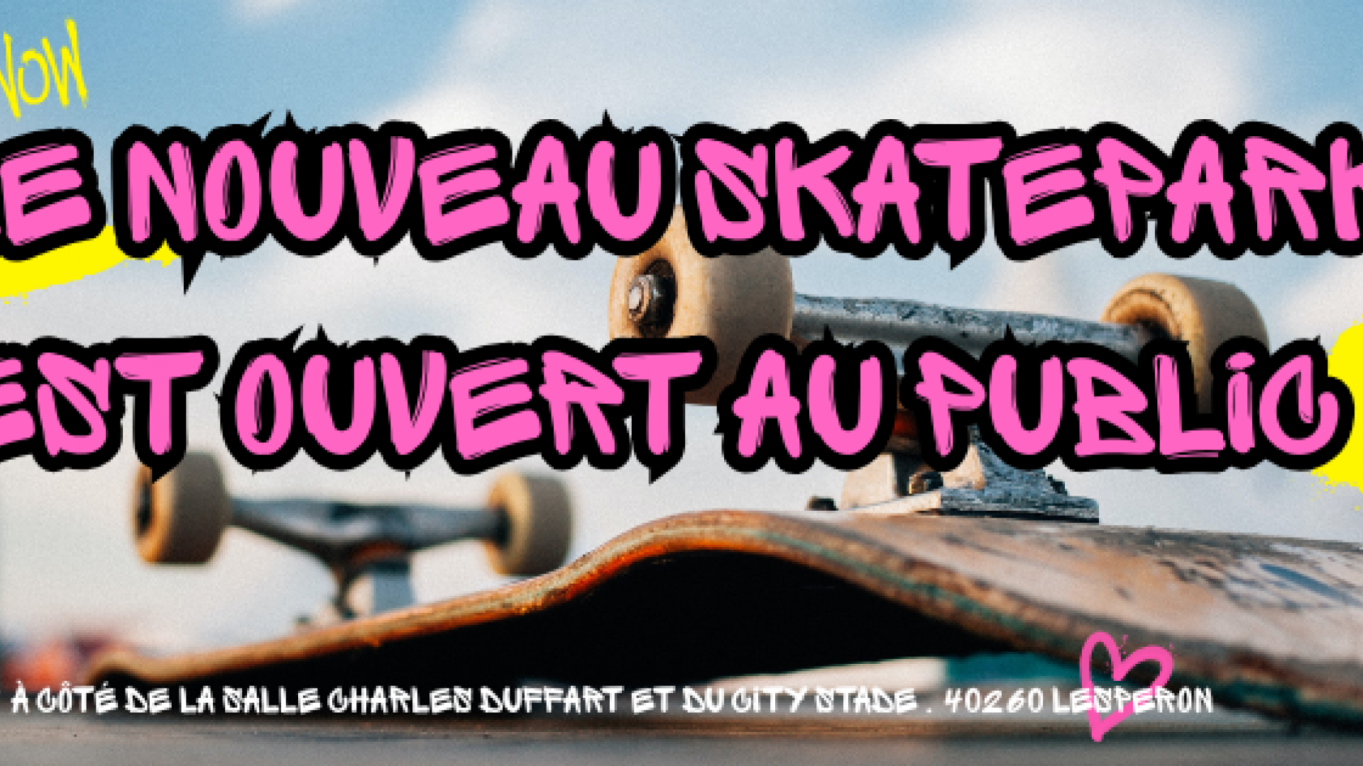 Ouverture du nouveau SKATEPARK ! Ouverture du nouveau SKATEPARK ! Publié le 08 juillet 2025 / Dernière modification le 16 mars 2026 Ouverture du nouveau SKATEPARK ! Publié le 08/07/2025 - Dernière modification le 16/03/2026 Du lundi 03 novembre 2025 à 08:00 au jeudi 30 avril 2026 à 12:00 Ouvert au public